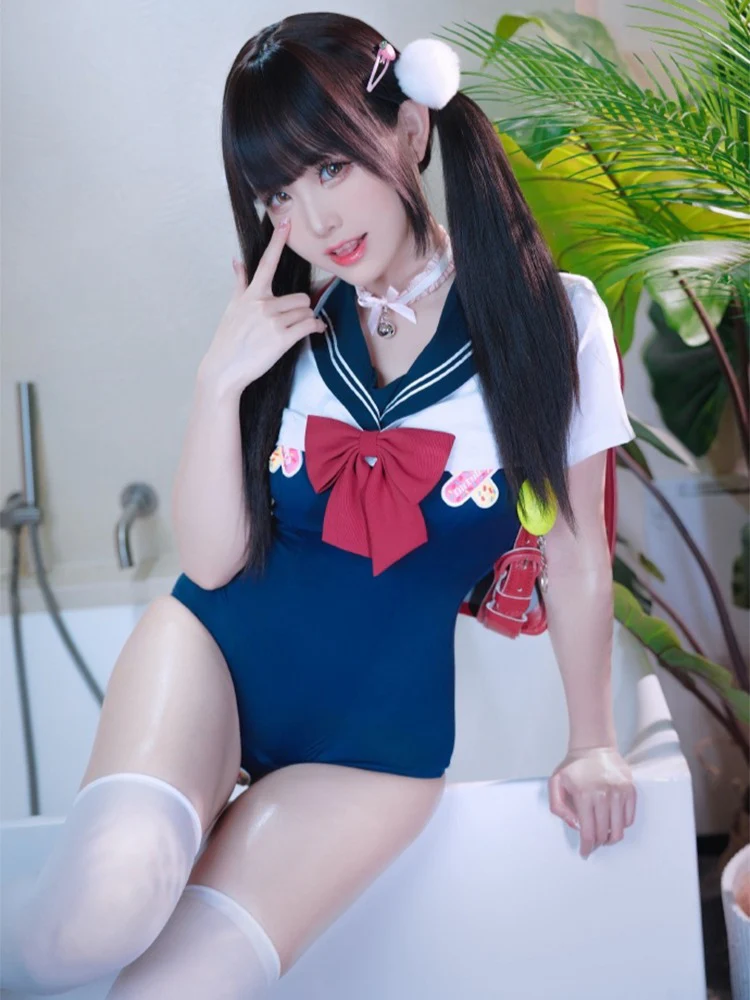🎀This adhesive bandage schoolgirl uniform swimsuit features a cute schoolgirl style in a navy blue color that is made with high-stretch nylon. 🎉