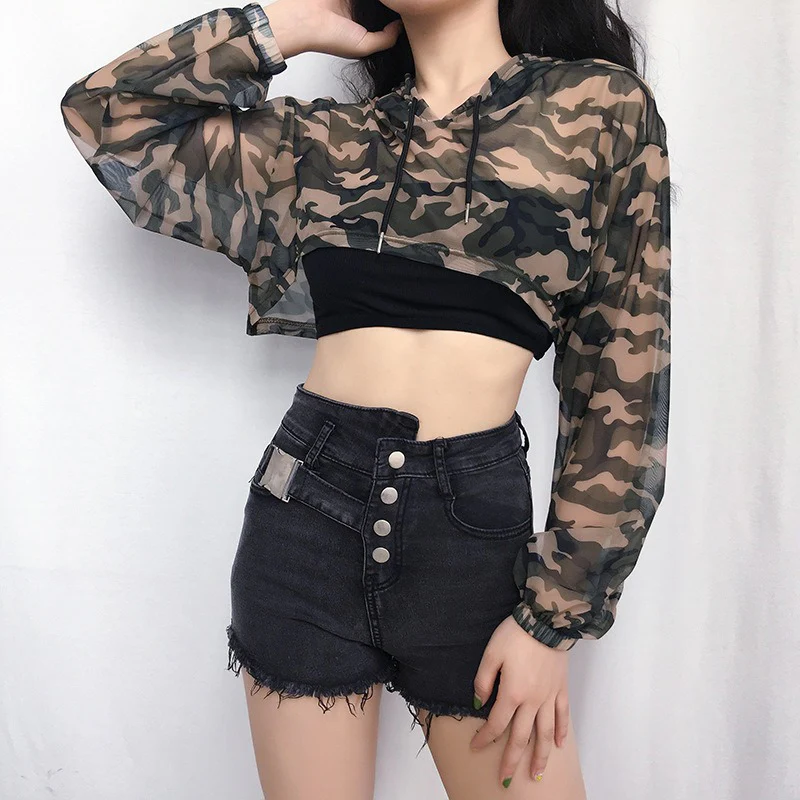 Spice up your wardrobe and stay ahead of the fashion game in this Fashion Camouflage Sheer Crop Hoodie. 🌟This edgy top features a trendy camouflage pattern, sheer mesh detailing, and an asymmetrical hem that shows off your midriff. 🌸 Unique twist to any outfit! Made for the bold and stylish, this hoodie is ideal for those cute femboys looking to make a statement.💕👀