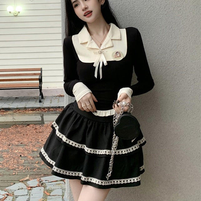 - Package including: Lapel Contrast Top *1+ Layered Skirt Set *1