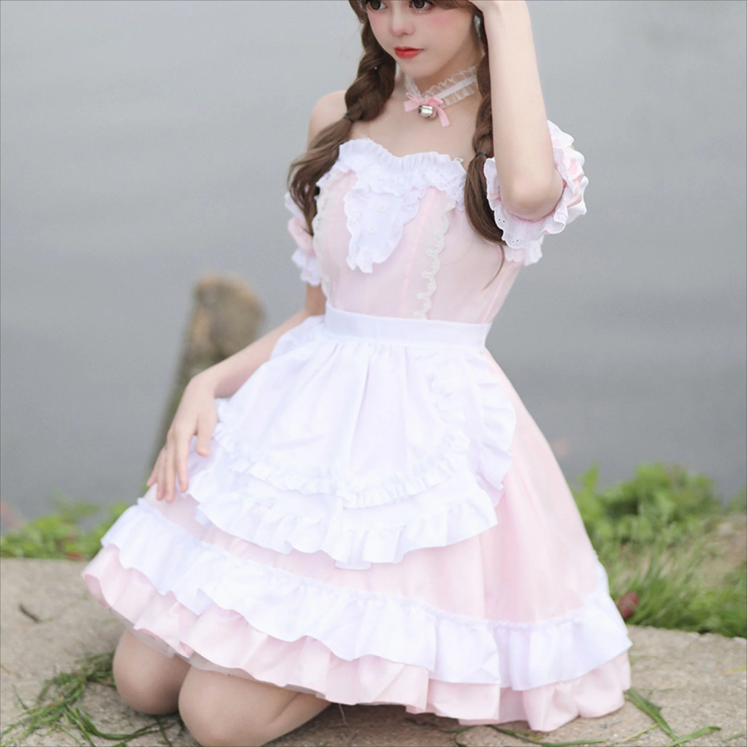 Product Package - Off Shoulder Maid Femboy Cosplay Dress + Apron+Headgear + Sleeves*2 + Necklace + Transparent Shoulder Strap