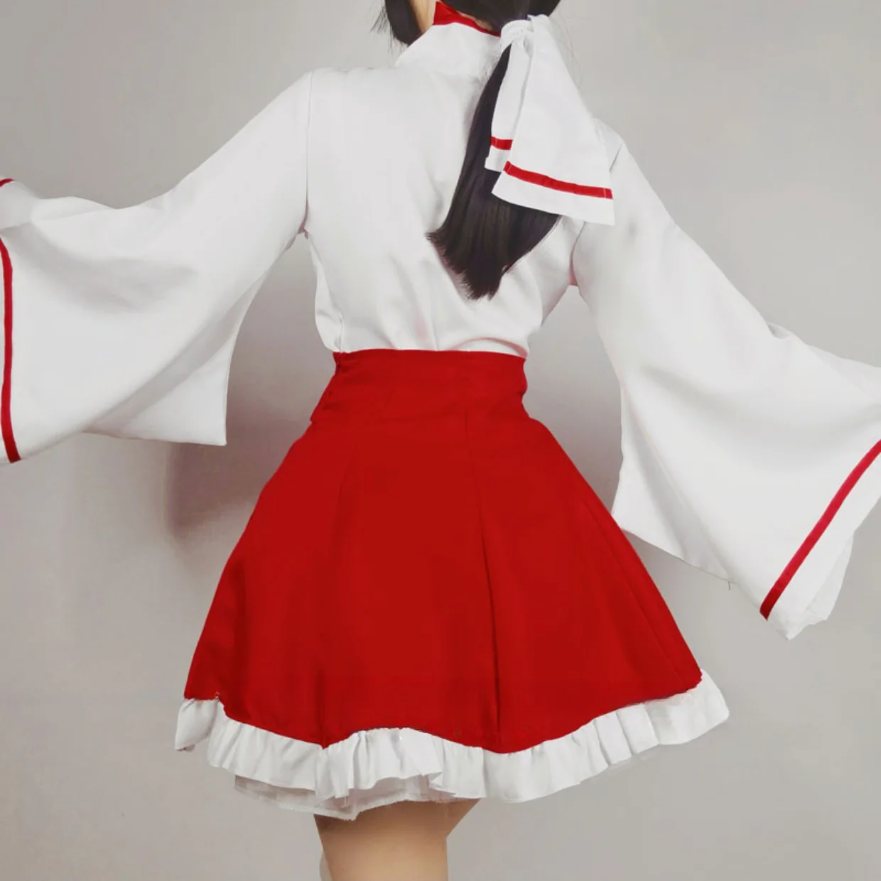 Transform into a beautiful Shrine Maiden with this Japanese kimono cosplay outfit. Made of polyester with moderate thickness, the outfit features a bell-sleeve top, ruffled skirt, and additional accessories, as shown in the product images. 🎀